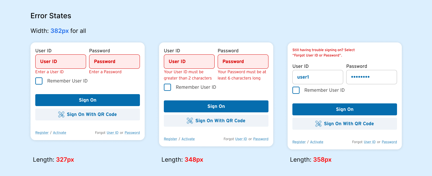 The final design has the height of 306px in the default state while fitting QR code method and created a hierarchy in the order of primary action items, the two Sign On CTAs, then Register/Activate & Forgot User ID/Password.