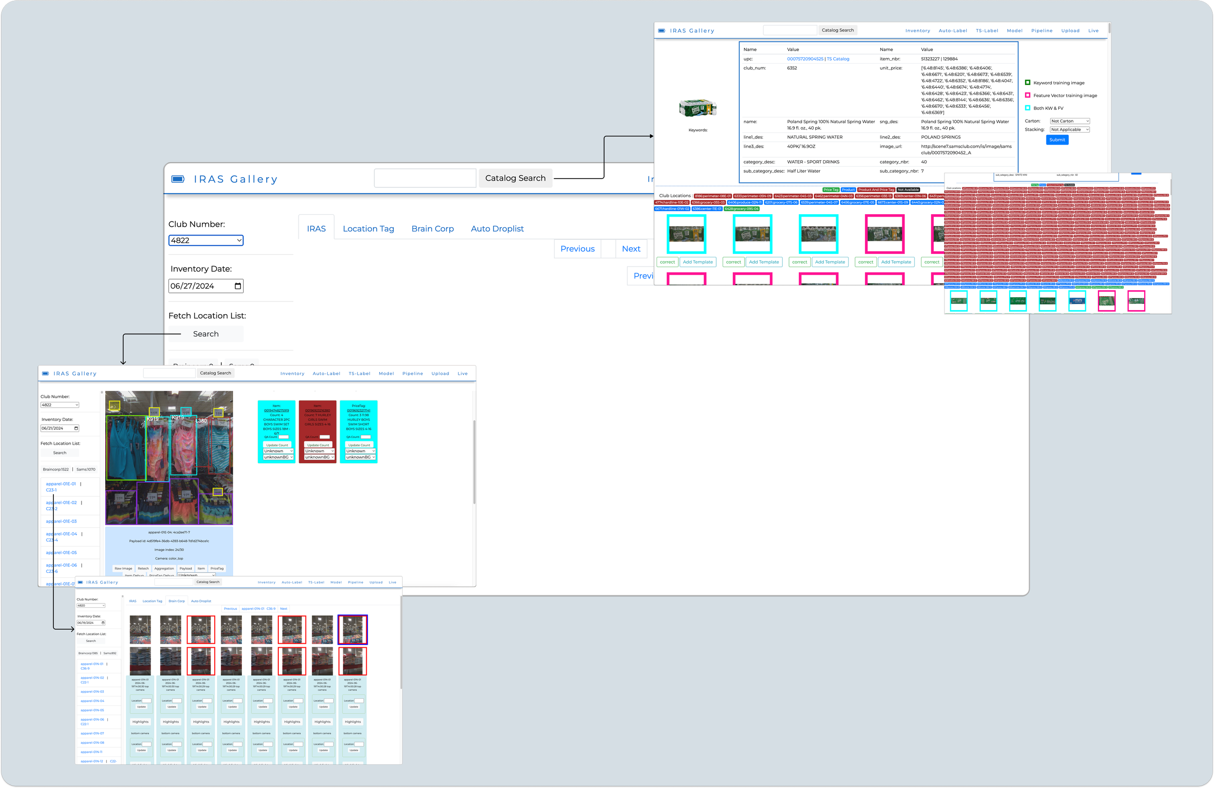 Auto-scrubber shelf images combine with live SKU data to give managers a complete view of any item: category, condition, on-hand quantity, and units per pallet. The same screen lists every other club that stocks the product, making transfers and restocks effortless.