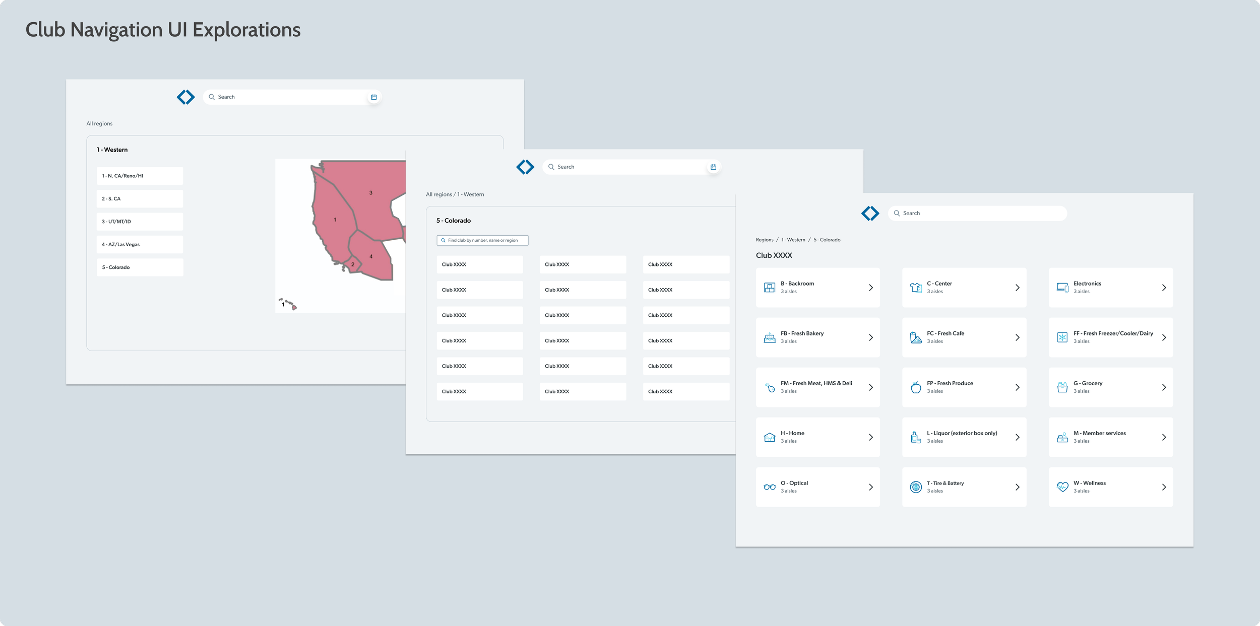 During working sessions with product and engineering, we tightened the MVP scope to just two goals: (1) search for any product and (2) drill down to a specific club. Extras like interactive maps or shortcut tiles added complexity and pushed us beyond that mandate, so we stripped them away to keep the experience laser-focused.